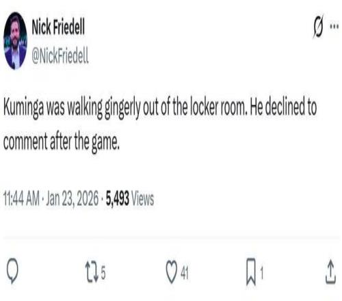結果本場庫明加又半場傷退,賽后勇士記者Nick Friedell透露,庫明加一瘸一拐離開球館,并且拒絕了采訪,科爾表示庫明加將接受核磁共振檢查。
